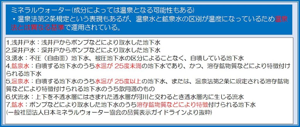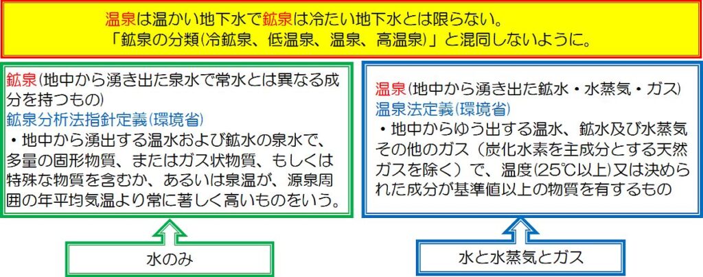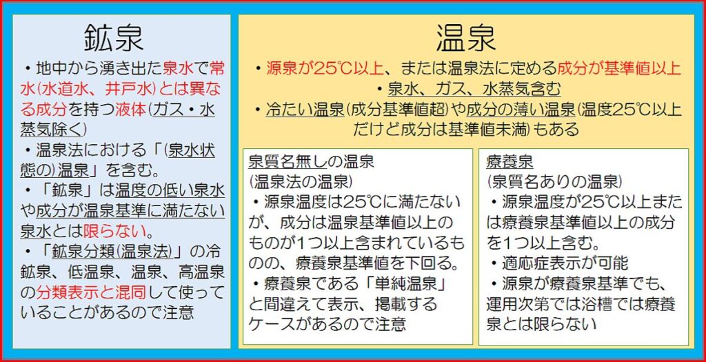 ※鉱泉は「地中から湧出するもの」、そのうち“温泉の定義に合致するもの”が「温泉」。別途、温度帯別の泉質分類では源泉温度が25℃未満のものを「冷鉱泉」と表示しているので混同しないように注意。