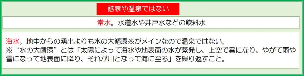 (温泉は温度や成分が湧出する位置が一定で、湧出水の温度、成分等が固定的継続的現象と認められることが前提になっています。海水にも温泉成分が入っていますが、地中からの湧出よりも水の大循環※がメインなので温泉ではありません)