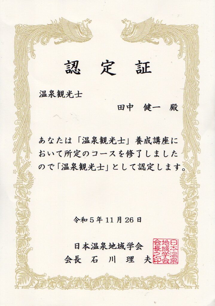 ・日本温泉地域学会 温泉観光士認定(2023年11月)
